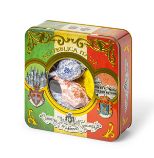 Los Amaretti son galletas presentes en todas las regiones de Italia hechas a base de pasta de almendra, elaborada con azúcar, clara de huevo, almendras dulces y amargas y carozos de albaricoque. En esta elegante presentación encontrarás un surtido de Amaretti crujientes, Amaretti suaves y los famoso Baci di Chiostro, envueltos individualmente en un elegante papel de seda de colores en una lata rectangular con ventana.