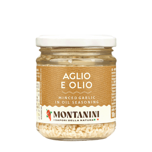 Aglio e Olio de Montanini es un condimento a base de ajo italiano en cubos conservado en aceite de girasol. Es una base lista para usar que sustituye al ajo fresco en sofritos, salsas y salteados.