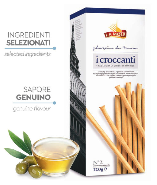 Grissinis crujientes y genuinos, los I Croccanti de La Mole son bastoncini (Palitos de Pan) elaborados según la más auténtica tradición italiana. F...